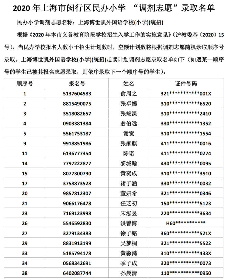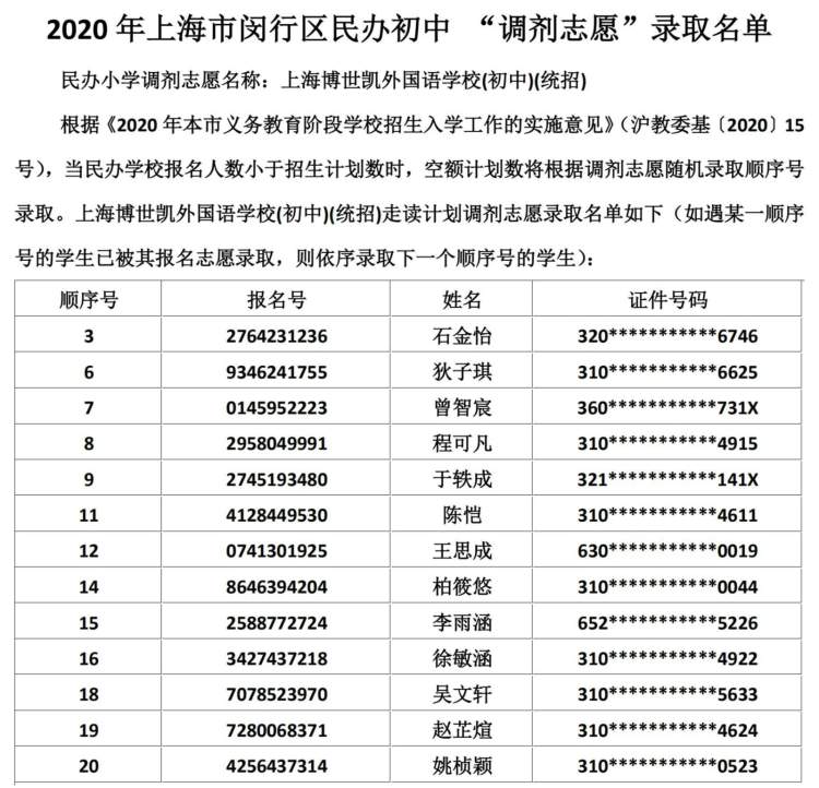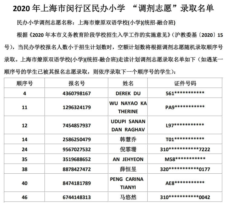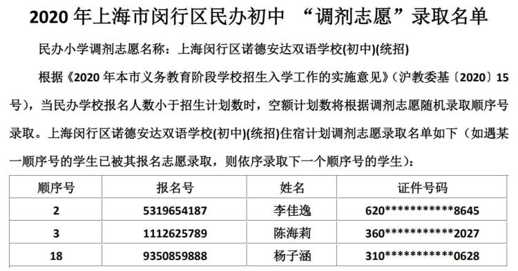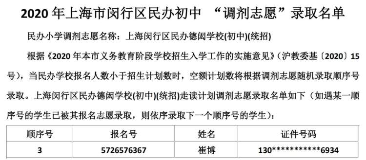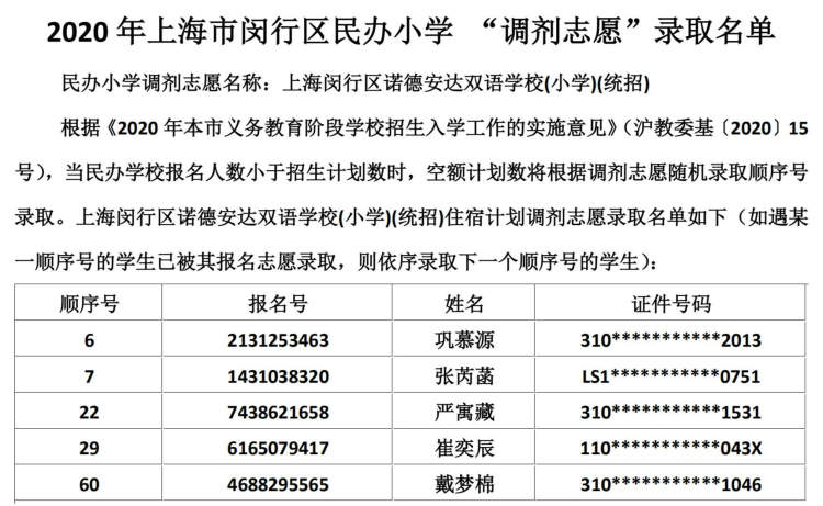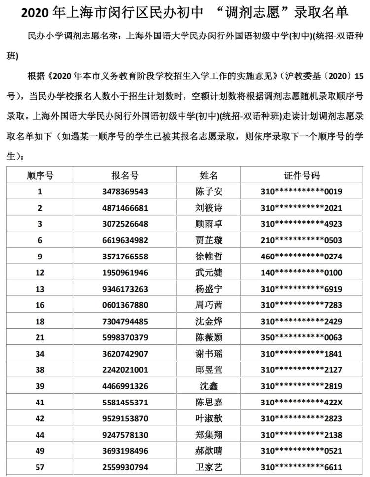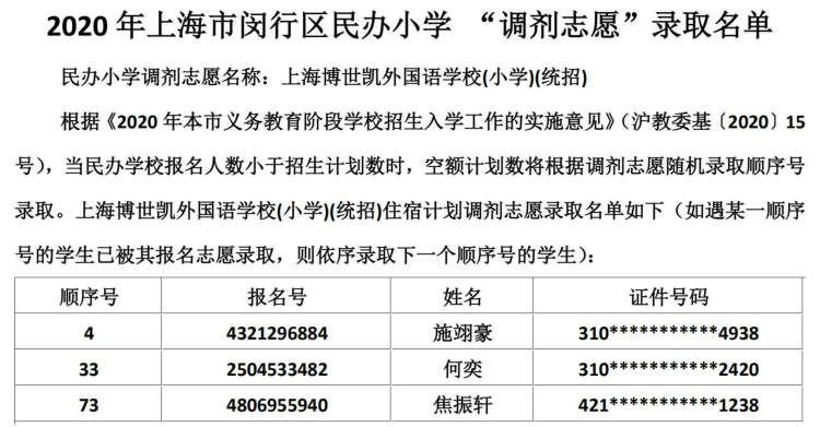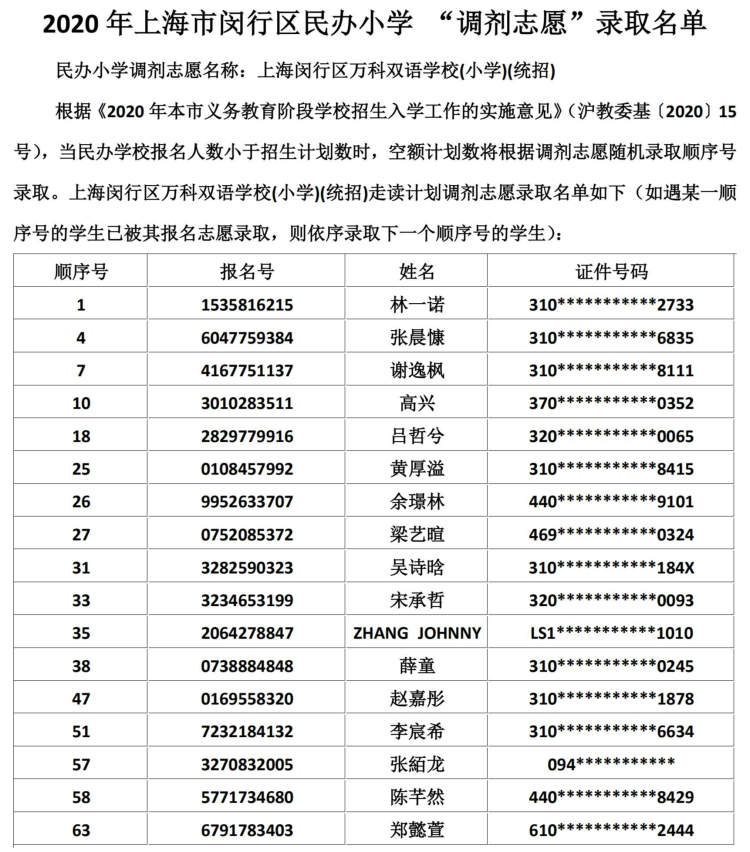 闵行区民办小学、初中“调剂志愿”录取结果公布啦 徐斌忠 2020-5-25 来源:周到上海 闵行区教育局在其官网公布了2020年该区民办小学、中学“调剂志愿”录取结果。 根据《2020年本市义务教育阶段学校招生入学工作的实施意见》,当民办学校报名人数小于招生计划数时,空额计划数将根据调剂志愿随机录取顺序号录取。 闵行区民办小学调剂志愿录取名单: 闵行区民办初中调剂志愿录取名单: 来源:周到上海 作者:徐斌忠 赞一个 (0)