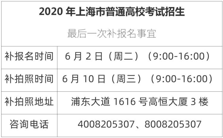 考虑到疫情影响,可能有个别考生错过前期考试报名,2020年上海市普通高校考试招生将安排最后一次补报名。