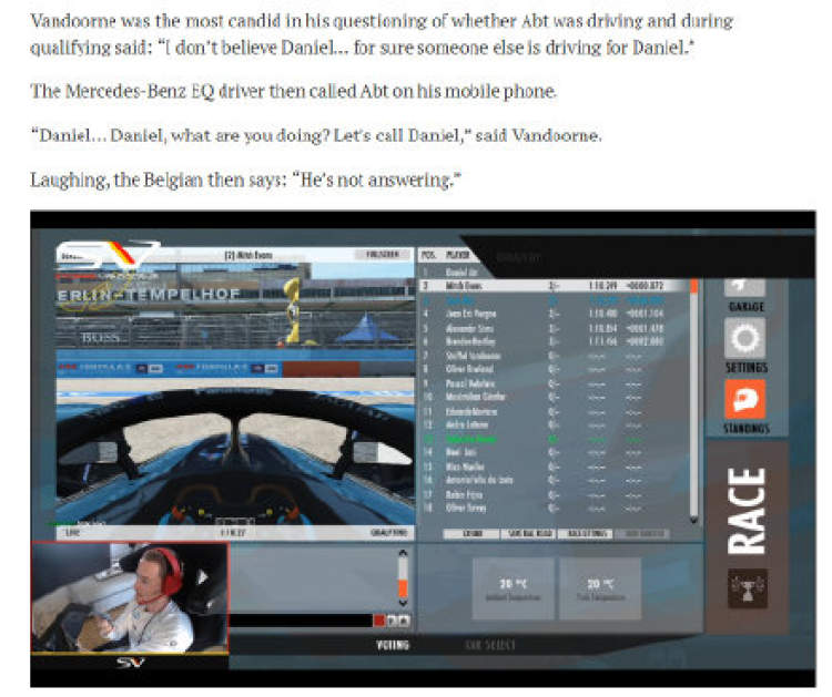 在阿伯特的转播画面中,车手用直播设备挡住了脸,这样的做法显然是蓄意为之。同时,一向在twitch直播自己比赛的阿伯特,在当天却没有转播这场比赛。