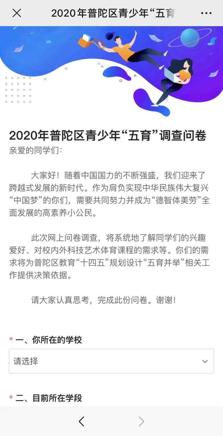 调查问卷则通过了解学生的兴趣爱好、对校内外科技艺术体育课程的需求、最喜欢的书等,从学生需求出发为学生的未来发展谋划,为普陀区教育“十四五”规划设计“五育并举”相关工作提供决策依据。