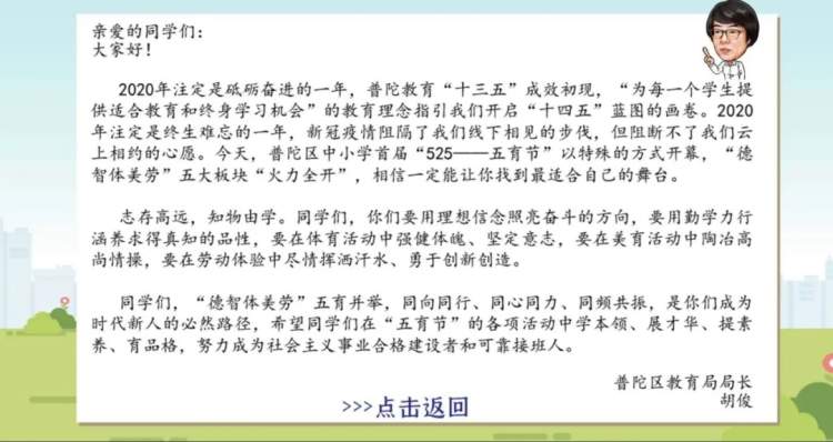 5月25日零时,云聚525——首届普陀区中小学“五育节”开幕式准点上线,拉开了2020这个特殊年“五育节”的序幕。