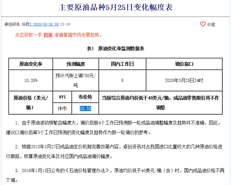 由于当前综合原油均价低于40美元/桶,将触发国内油价地板价保护机制,国内油价依旧不作调整。目前国际原油均价接近34-36美元之间,距离40美元/桶还有近5美元的距离,因此,目前国际原油价格涨势受到阻力,本周四前突破40美元可能性并不大。因此,5月28日92和95号汽油价格调整大概率搁浅。