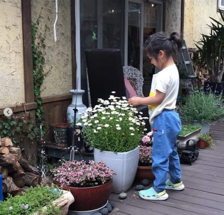 还有一张照片,是女儿Summer站在花盆边,露出圆嘟嘟的侧颜,气质神似汤唯。