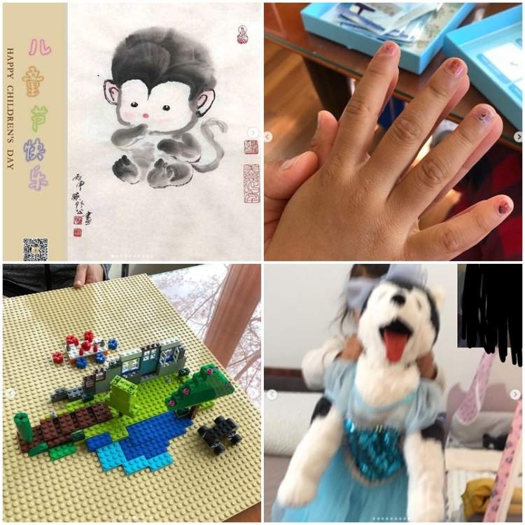 汤唯在社交平台分享了若干生活点滴,包括爸爸画的猴子、女儿做的美甲、家人一起组的乐高庭院、穿上公主装的狗玩偶等。
