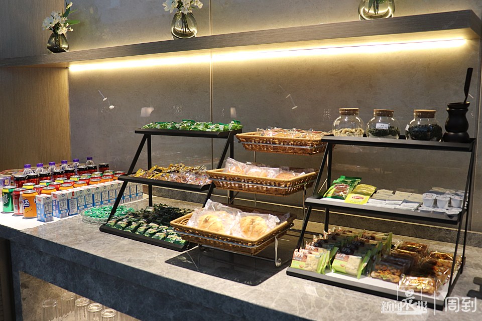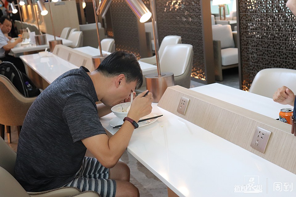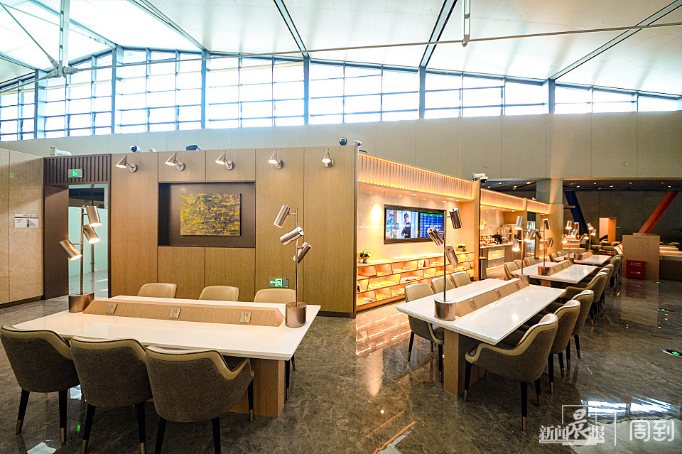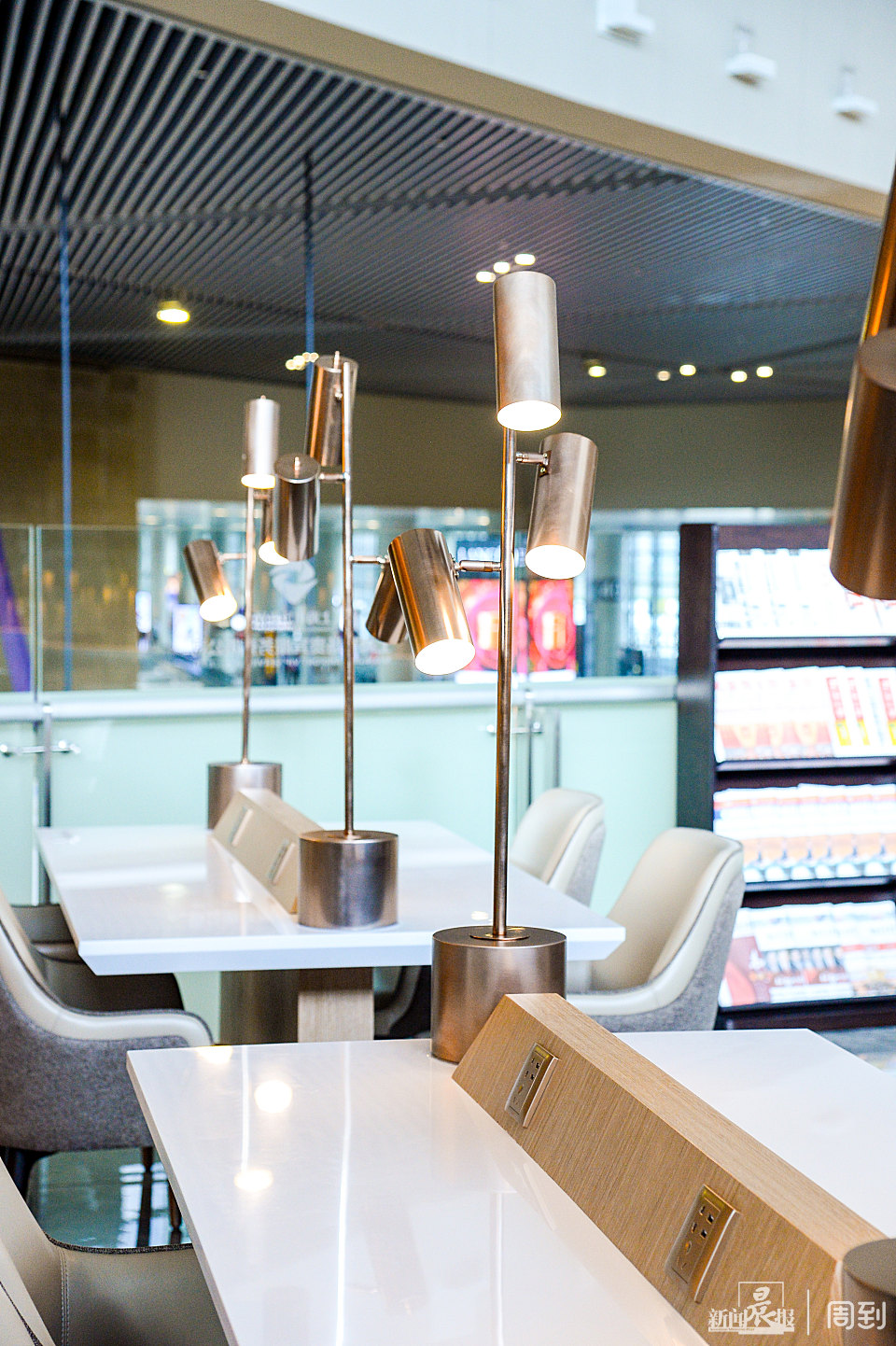 除了各类美食,贵宾室内还有不少“小心机”。重新装修后的V1贵宾室,每个座位上都有充电插口,方便商旅人士在候机休息期间办公或是为手机充电。