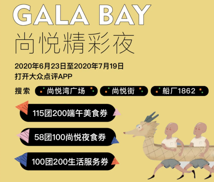 大家可以在大众点评上搜索【尚悦湾广场】、【尚悦街】或是【船厂1862】,就可以get【115团200端午美食券】、【58团100尚悦夜食券】和【100团200生活服务券】哦!