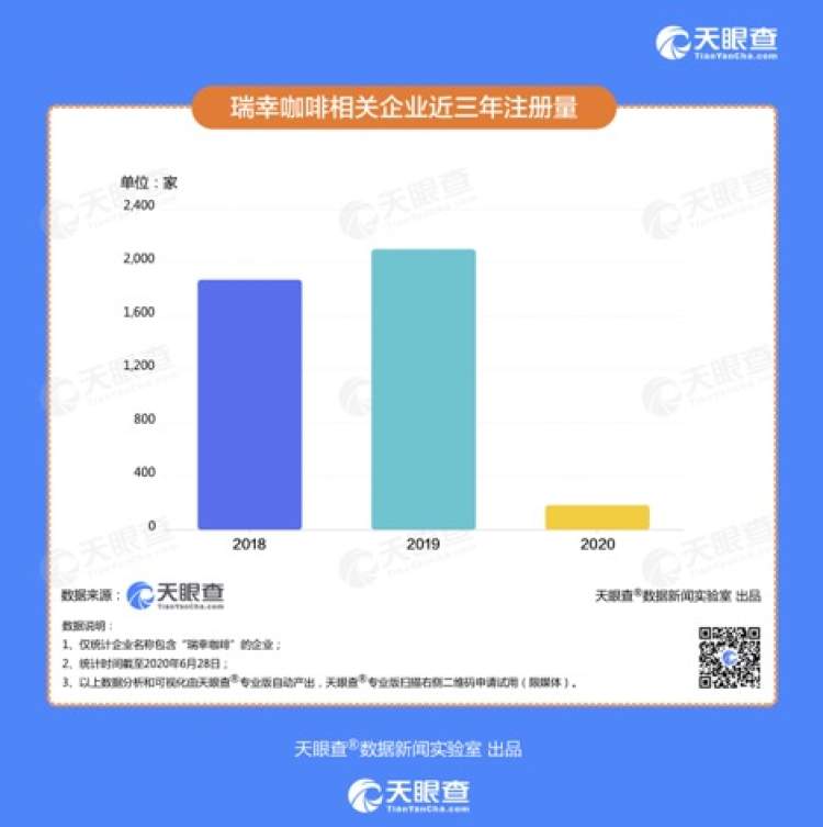 从企业数量来看,2017年新增2家“瑞幸咖啡”企业,2018年新增约1,800家,2019年新增企业数量超过2,000家;值得注意的是,2020年至今,我国仅新增186家企业名称中含“瑞幸咖啡”的企业,较去年同期相比增速为-80.6%。另外,以工商登记为准,我国今年共有99家相关企业已经注销或吊销。