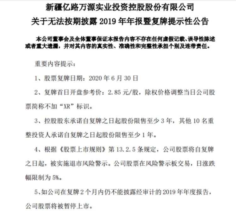 6月28日晚间,公司披露称因无法在6月30前披露2019年报。截至2020年6月29日,公司未按期披露2019 年年度报告停牌已满2个月,根据《股票上市规则》第 13.2.5 条的规定,公司股票自2 个月停牌届满的下一个交易日起复牌。经公司申请,公司股票将于2020 年6月30 日复牌。