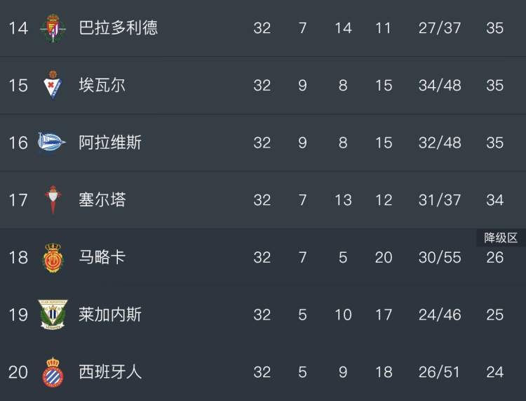 本轮在保级线之上的两支球队都有积分进账——塞尔塔主场2:2逼平巴塞罗那,埃瓦尔客场2:1力克格拉纳达。西班牙人在本赛季还剩6轮的情况下,已经离保级线足足有10分的差距。