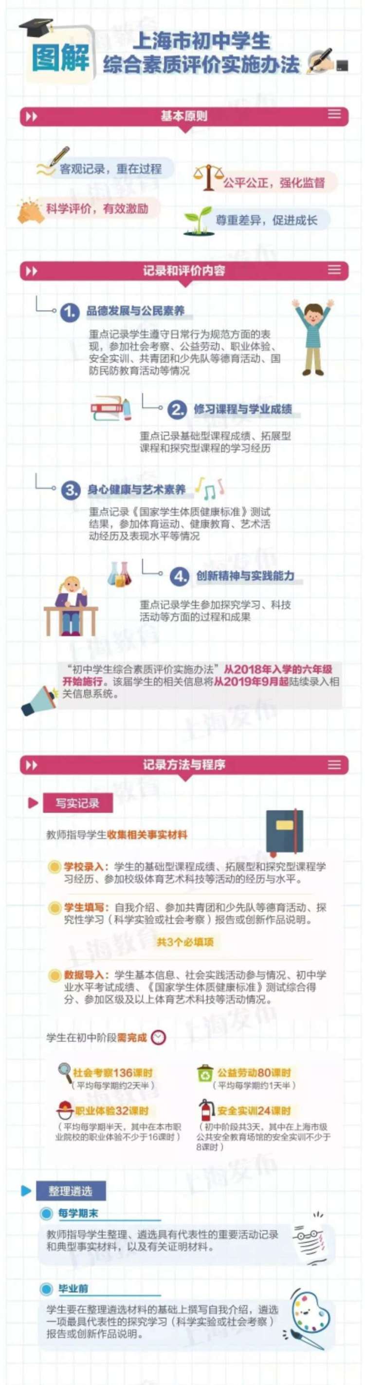 《上海市初中学业水平考试实施办法》自2017年入学的六年级起实行,《上海市初中学生综合素质评价实施法》自2018年入学的六年级学生开始实施。