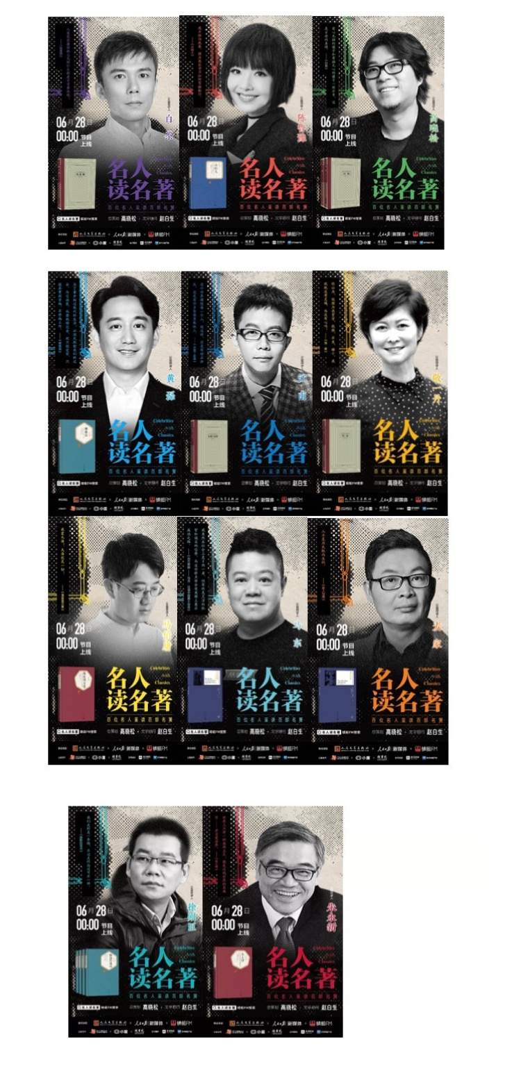 6月28日0点,可以通过蜻蜓FM和人文读书声平台听到的名人领读名著为:白茶读《我是猫》、陈鲁豫读《小妇人》、高晓松读《白痴》、黄磊读《樱桃园》、江南读《永别了武器》、敬一丹读《简·爱》、马伯庸读《海底两万里》、马东读《百万英镑——马克·吐温中短篇小说选》、麦家读《老人与海》、莫文蔚读《雪莱抒情诗选》、徐则臣读《静静的顿河》、朱永新读《名人传》。