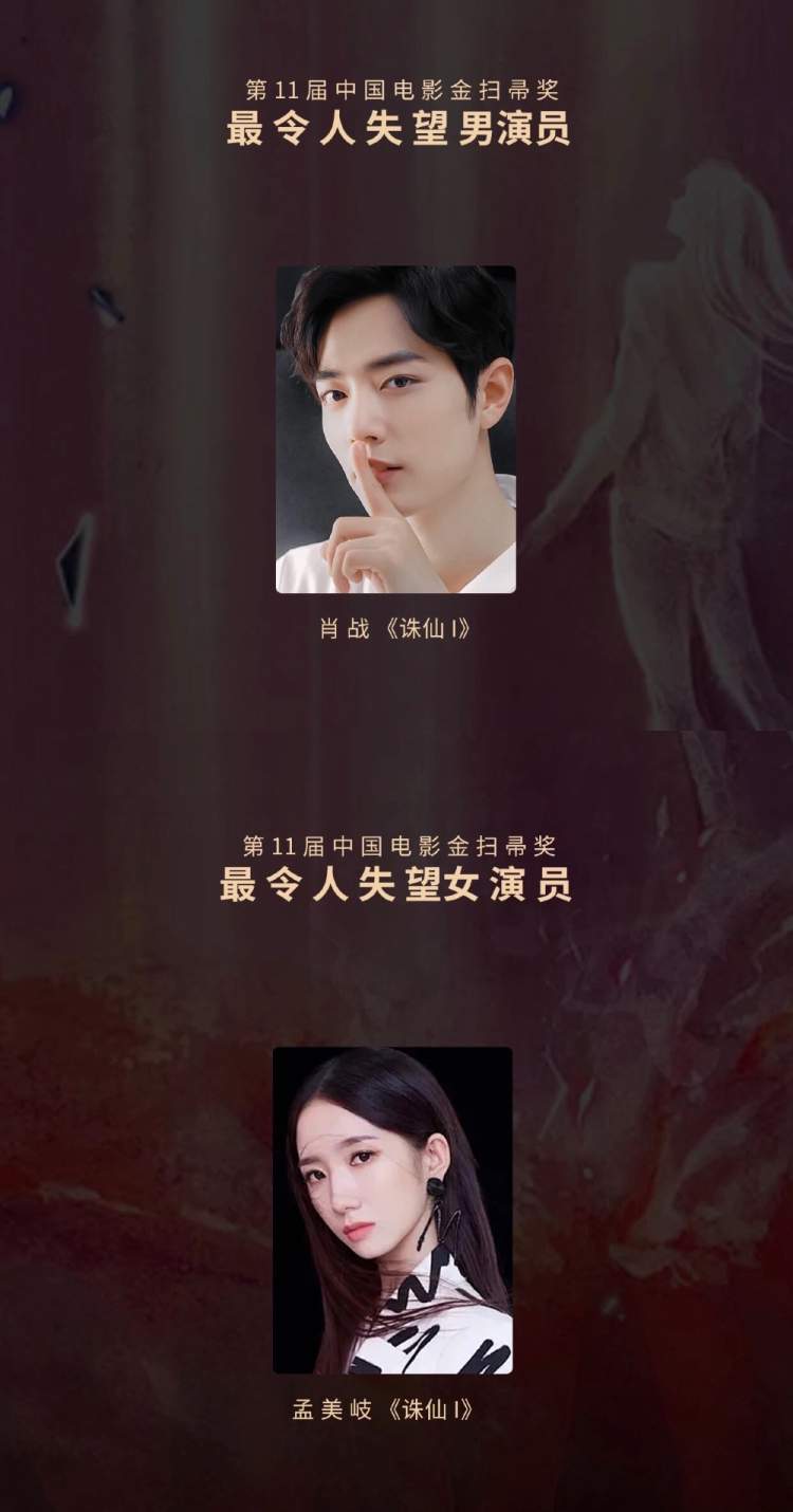 随后颁发的金扫帚奖中,《诛仙Ⅰ》剧组没能幸免。主演肖战、孟美岐分获最令人失望男女演员,《诛仙Ⅰ》也被评选为最令人失望影片。
