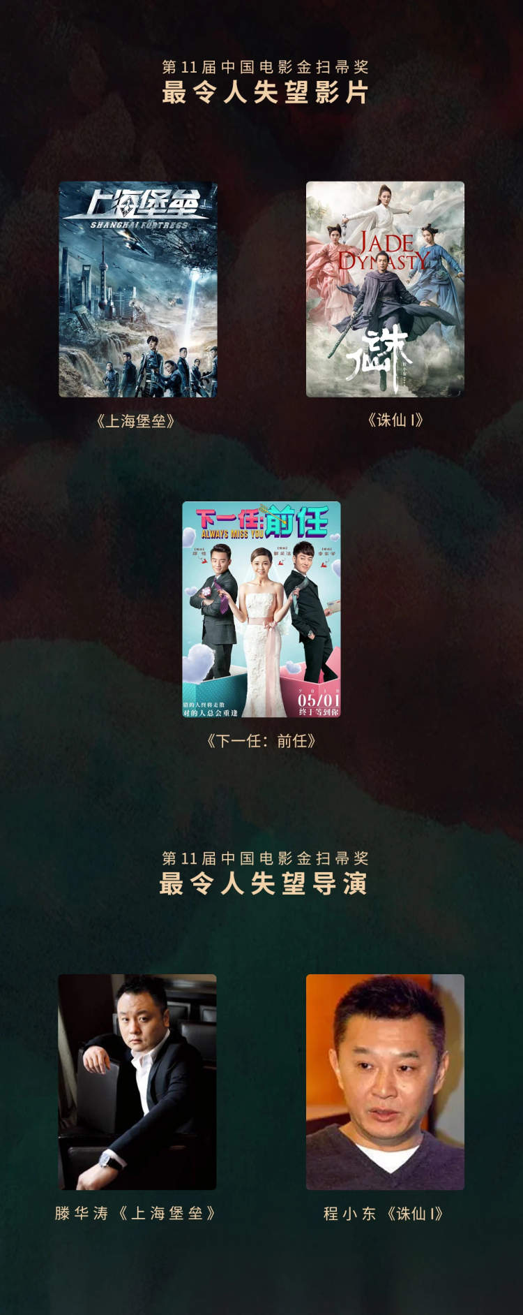 另外,《诛仙1》的导演程小东也未能逃过一劫,被评为最令人失望导演,同样获奖的还有《上海堡垒》导演滕华涛,该奖项由此前领过金扫帚奖的导演毕志飞颁出。