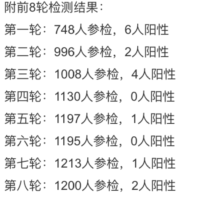 结果发现,在九轮检测中,均出现了确诊病例,截止到目前,已经有19人确诊。