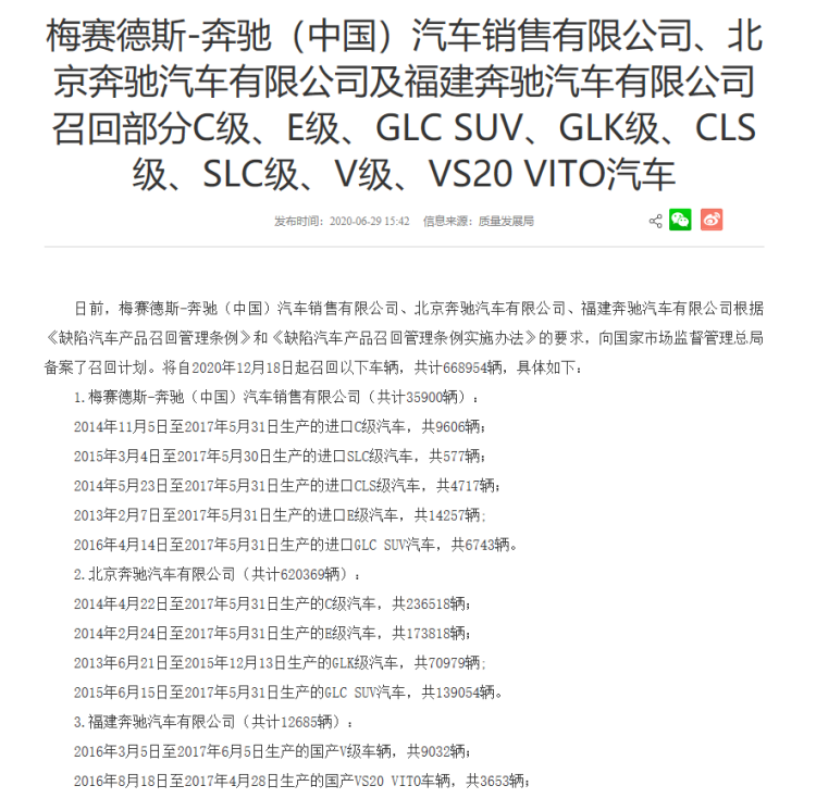 国家市场监管总局网站披露发布消息,日前,梅赛德斯-奔驰(中国)汽车销售有限公司、北京奔驰汽车有限公司、福建奔驰汽车有限公司根据《缺陷汽车产品召回管理条例》和《缺陷汽车产品召回管理条例实施办法》的要求,向国家市场监督管理总局备案了召回计划,将自2020年12月18日起召回共计668954辆车辆,涉及进口奔驰C级汽车、SLC级汽车、GLC SUV汽车等车型。