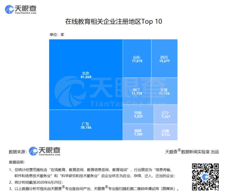 天眼查专业版数据显示,我国目前共有超过25万家从事在线教育相关业务的企业。截至6月29日,以工商登记为准,2020年1-5月有超过2万家相关企业注册成立(全部企业状态),平均每天新增140家在线教育相关企业。在线教育相关企业筛选方式:经营范围含“在线教育、教育咨询、教育信息咨询、教育培训”,行业限定为“信息传输、软件和信息技术服务业”和“科学研究和技术服务业”。