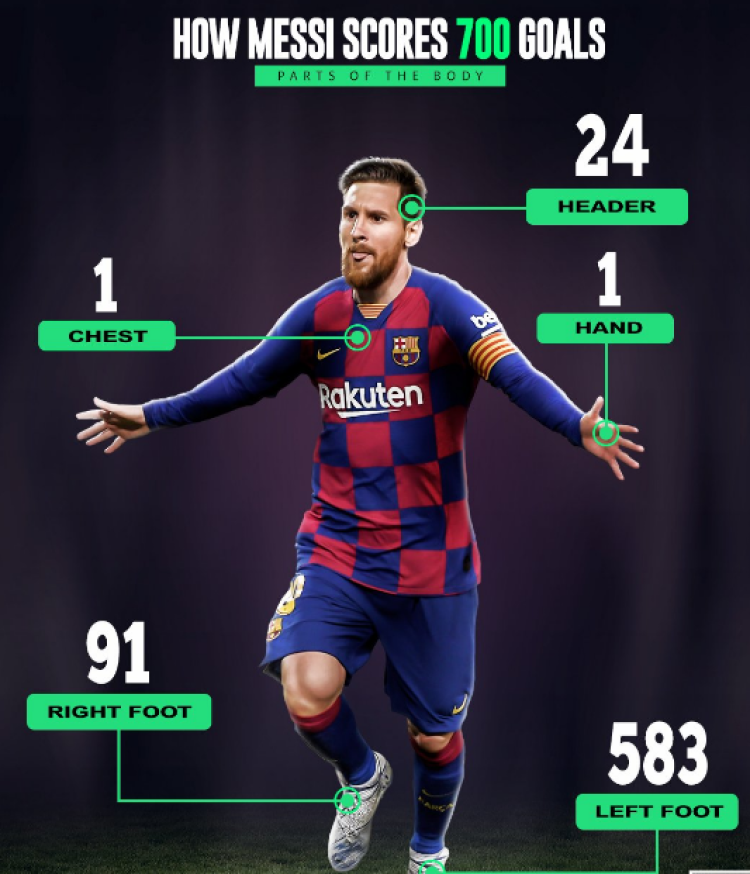 此前,梅西分别为巴萨和阿根廷国家队打进了630球和70球。