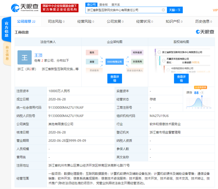 天眼查数据显示,6月28日,浙江省新型互联网交换中心有限责任公司成立。该公司注册资本1亿元人民币,法定代表人是王顶,公司经营范围包括数据处理服务;互联网数据服务;计算机软硬件及辅助设备批发;计算机软硬件及辅助设备零售;通信设备销售;软件开发;信息系统集成服务;信息技术咨询服务等。