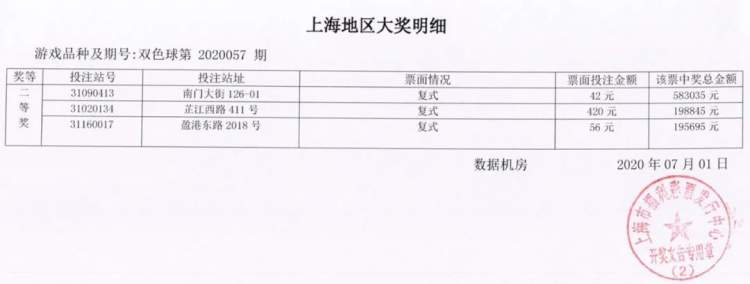 数据显示,上海地区中得5注二等奖,单注奖金193145元,彩票分别售出于南门大街126-01、芷江西路411号、盈港东路2018号福彩销售点,最幸运的那位彩民奖金额度也超过了58万元。
