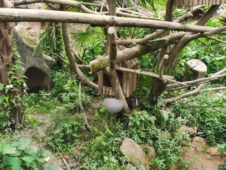 在马来熊展区,饲养员为了让它们生活得有滋有味,展区里做了许多环境丰容:有假树、山洞,还挖了个蓄水池,满足它们攀援、躲藏、游玩的需要。