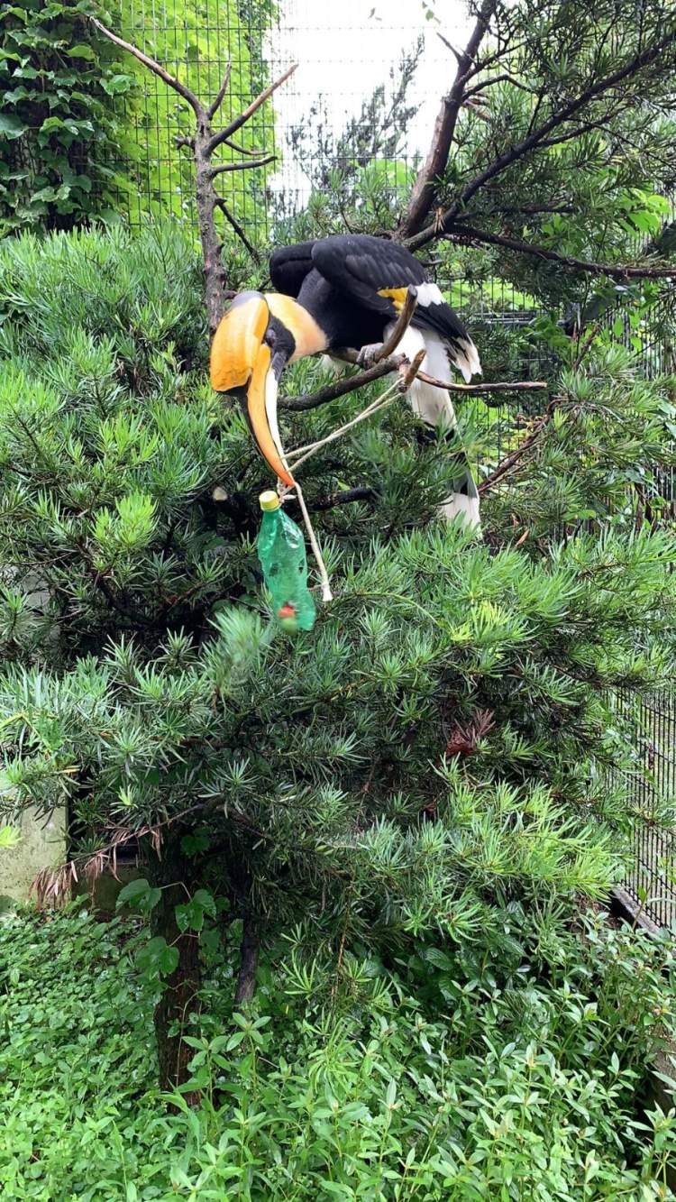 食物丰容是另一种丰容手段。在双角犀鸟展区,饲养员把水果塞进雪碧瓶,再挂在树上,增加双角犀鸟取食难度。