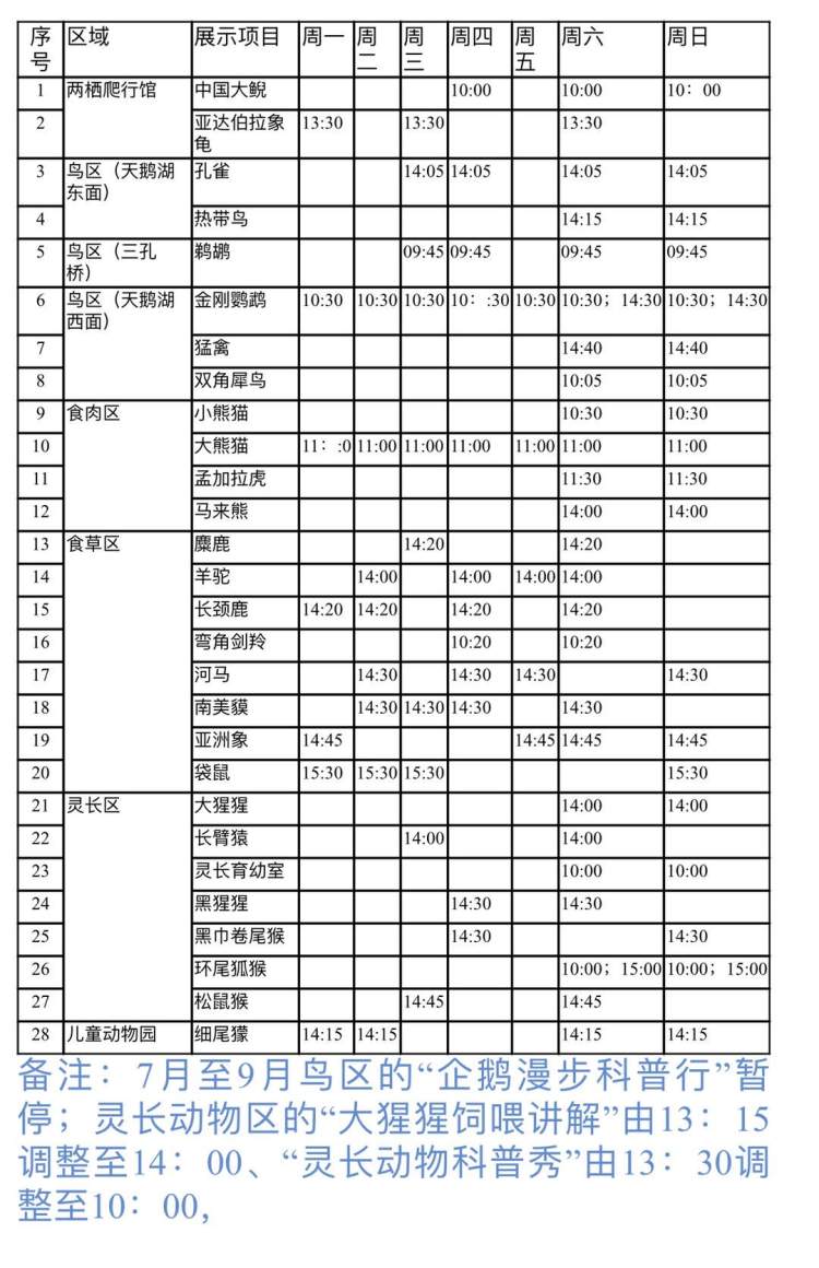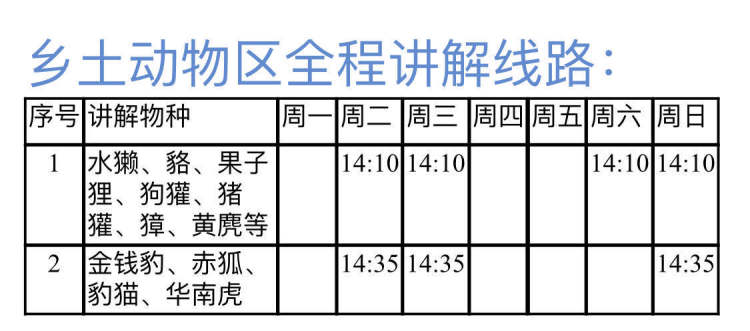 你可以收藏一下下面两张最新的讲解时间表,掌握饲养员讲解时间,踩准时间不踏空。