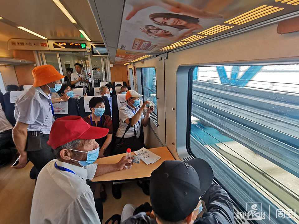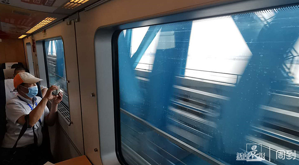 12点38分,列车驶出站台,登上了列车的观桥团成员们举着手机对着窗外,只为了锁定窗外飞驰而过的风景。