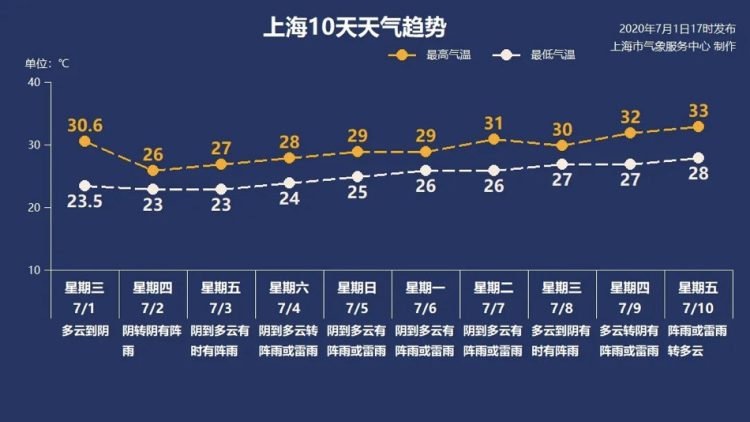 上海中心气象台预报,明天上海转为阴有阵雨的天气,南部地区雨量中等。雨水打压下,气温下调,在23-26℃之间;东到东南风3-4级。