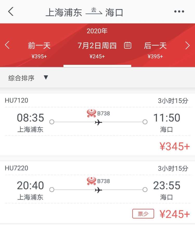 至于能否飞回本钱,就需要各位自己算算下半年打算去几次海南了。按照海航APP上的查询,明天的浦东—海口,机票价格并不高,晚班最低才245元。金鹏的浦东—三亚,明天的班次,最低价格目前是400元。
