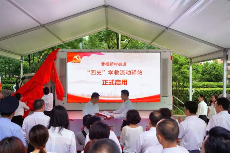 今天,普陀区曹杨新村街道首场浸润式情景党课在曹杨新村村史馆举办。广大党员同志们在数来宝、评弹、小品等现场演绎中,再一次深刻地接受了“四史”教育。而为了让更多的社区民众也能一同接受“四史”教育,曹杨新村街道更创新推出的“四史”学教新形式——“四史”学教流动驿站。将升降大屏、移动舞台开进社区,传递更多红色文化、感染更多党员群众。