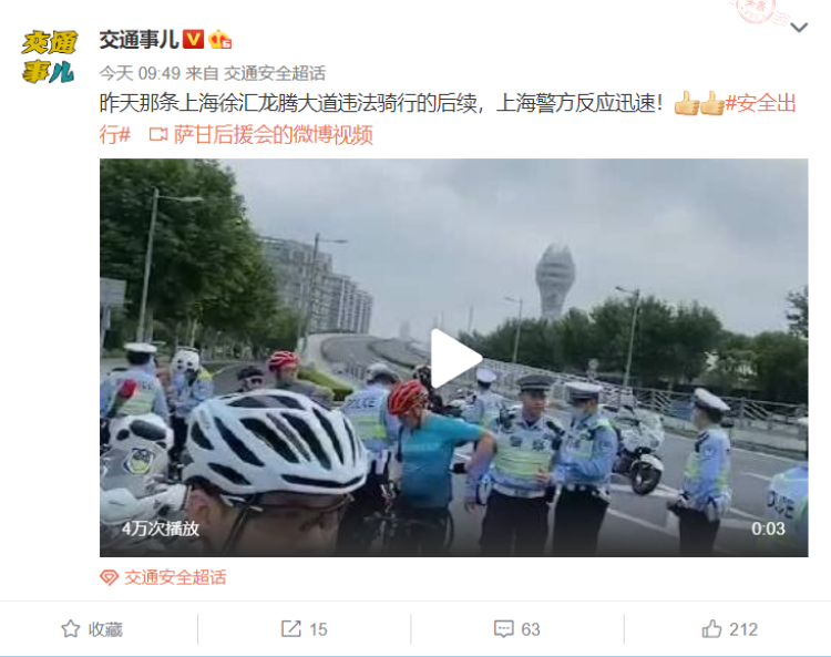 很快,就有了网络上流传的第二段视频画面——7月1日早晨5时30份许,徐汇区龙腾大道有大量自行车骑行人被拦在路边,多名交警在现场执法整治。