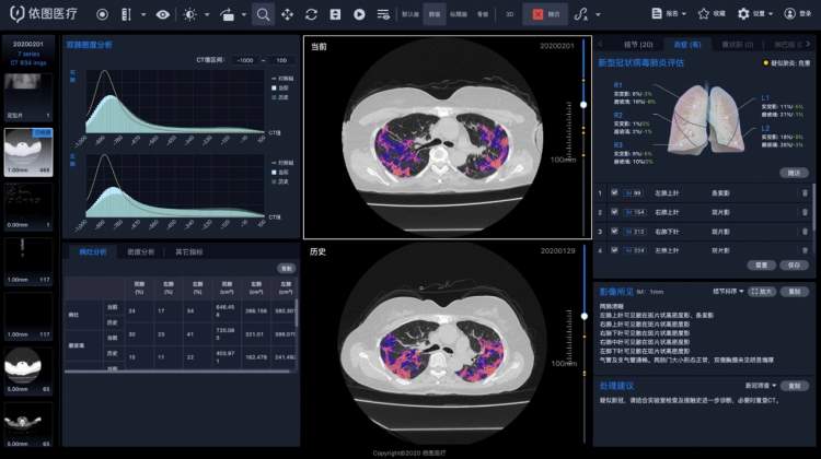 在上海市第七人民医院,胸部CT新冠肺炎智能评价系统在胸部CT新冠肺炎智能评价系统正式发布第二天就已经部署完毕,并立刻投入到一线诊疗工作。通过先进的图像算法实现了对新型冠状病毒性肺炎CT影像的智能化诊断与定量评价,并对局部性病灶、弥漫性病变、全肺受累的各类肺炎疾病严重程度进行分级;通过对病灶的形态、范围、密度等关键影像特征定量和组学分析,精确测算疾病累计的肺炎负荷,实现对CT的全肺病变动态4D对比,有助于临床判断病情,评估疗效,预测预后,为临床提供决策支持。