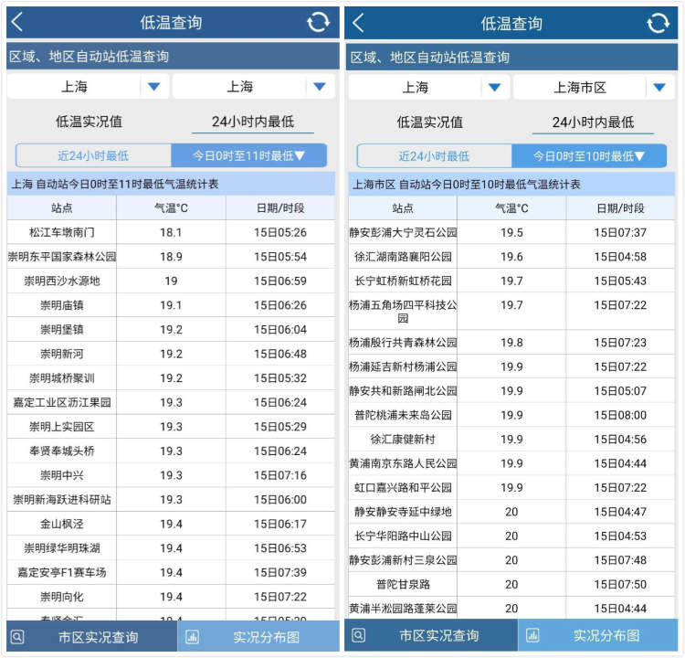 松江车墩南门和崇明东平国家森林公园测得最高气温不足19℃,市区也有11个自动气象站不足20℃。