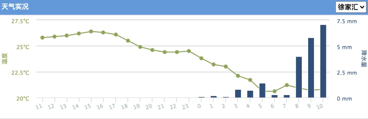 昨天下午,最高气温还在26℃以上,然后开始往下跌。到了夜里,雨水来看,气温继续往下探,到了清晨已经来到了20℃的附近。上午雨水增多后,气温难有起色。