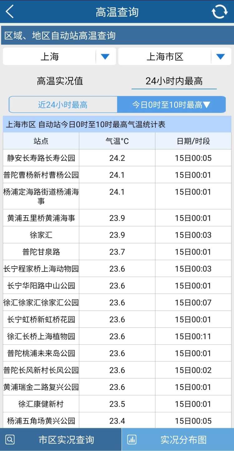 市区各自动气象站0时至10时的最高气温,不在白天,而竟然扎堆地出现在半夜零点附近。