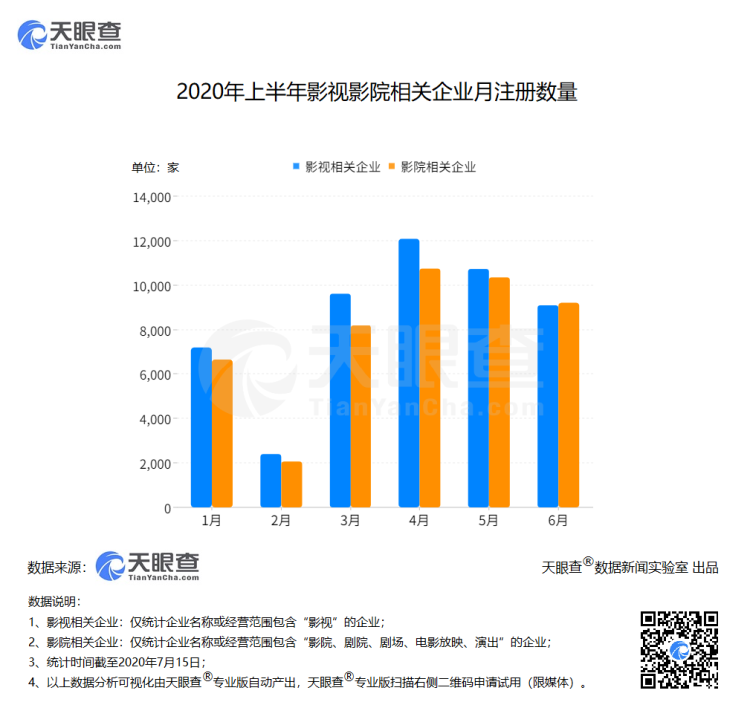 截至7月15日,以工商登记为准,天眼查专业版数据显示,我国今年上半年新增企业名称或经营范围含“影院、剧院、剧场、电影放映、演出”的企业超过4.7万家(全部企业状态,以下简称“影院相关企业”),其中4月和5月新增相关企业数量均过万。