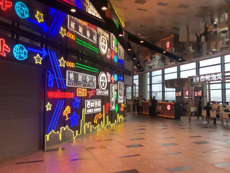 近日,虹桥T2北候机区美食广场全新升级开业,富有冲击力的霓虹店招墙、可观赏机坪航空器运行的景观位成为虹桥机场又一处“打卡”点。