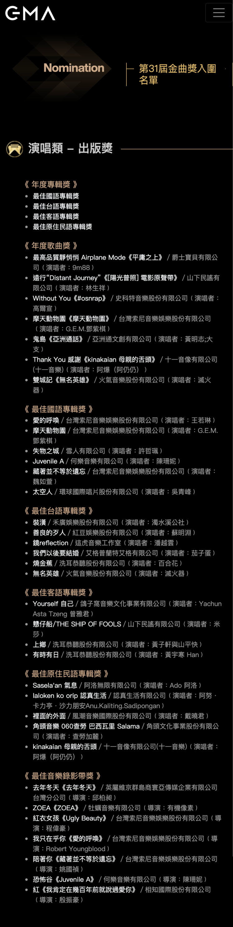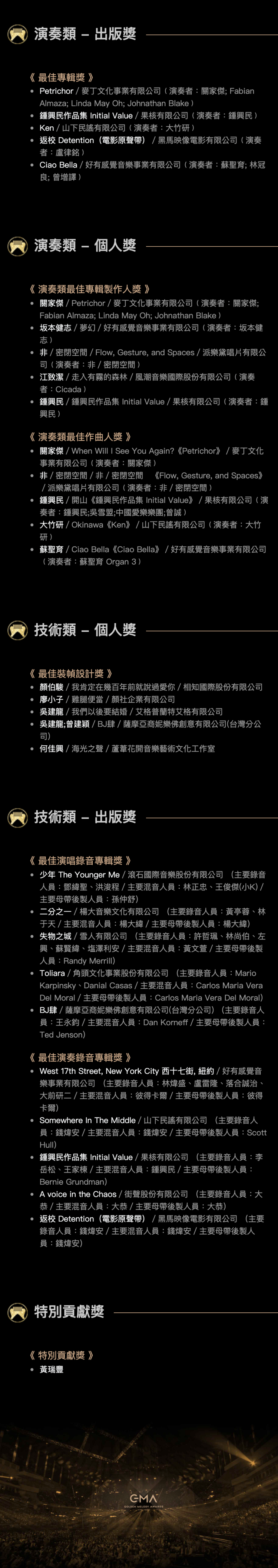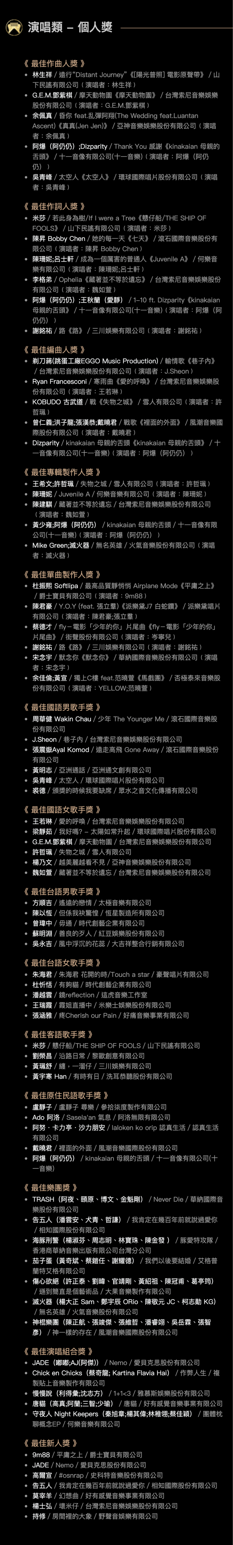 这次入围的大赢家是阿爆,总共有8奖入围,分别是最佳作曲人、最佳编曲人、最佳原住民语歌手、最佳原住民语专辑、最佳作词人、最佳专辑制作人、年度歌曲奖和年度专辑奖。