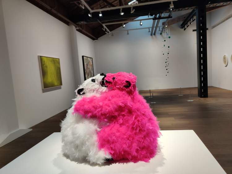 当然,贝浩登在疫情后推出的第一个展览《群展:乐园》也是值得一看的。在一间展厅里,你能一次性看到17位艺术家的代表作品,每一件都具有明显的艺术家个人特征。白色和粉色的熊拥抱在一起,令人印象深刻。
