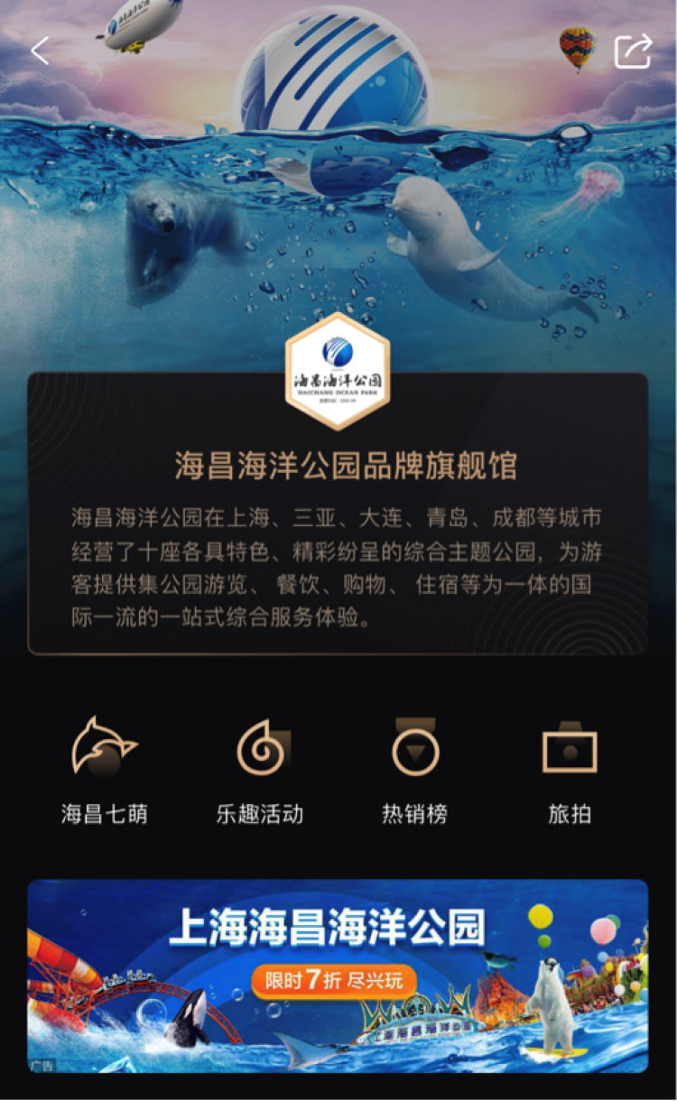 海昌海洋公园在中国经营海洋类的主题公园近二十年,目前在大连、上海、青岛、天津、烟台、武汉、成都、重庆、三亚等地经营了十座各具特色、精彩纷呈的综合主题公园。每年游客接待量超2000万人次,累计游客接待量超1.4亿人次。携程与海昌海洋公园签署战略合作之后,消费者可在携程品牌旗舰店享受更加便捷的订票、入园体验,以及全方位的服务保障。