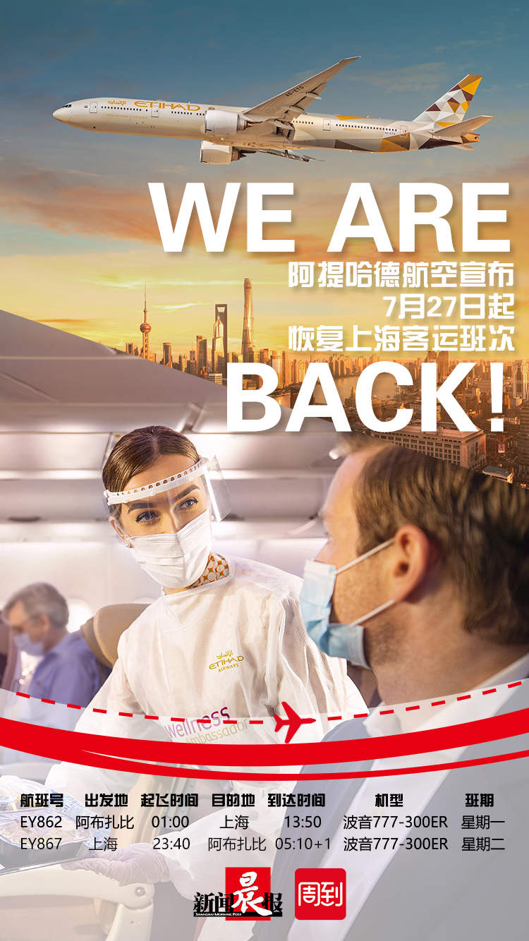 但阿联酋的阿提哈德航空公司没有落地广州,自7月27日起,该航司将恢复往返于阿布扎比和上海的航班,每周一班。