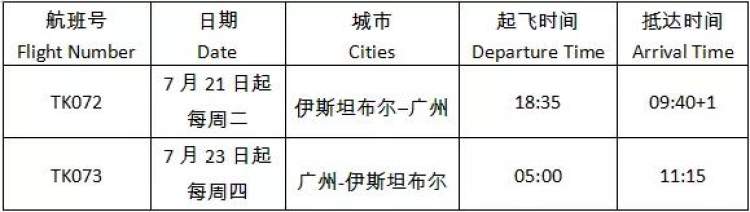 根据土耳其航空官方微信公众号发布的最新消息,土航计划于7月21日复飞中国大陆的航班,目的地为广州。近期,中东、非洲地区多家航司也陆续开启复飞广州的航班,相关时刻表周到君将一并奉上。