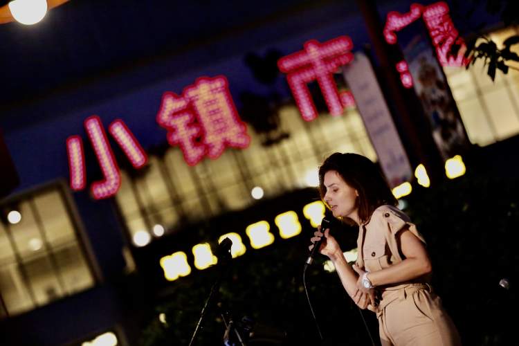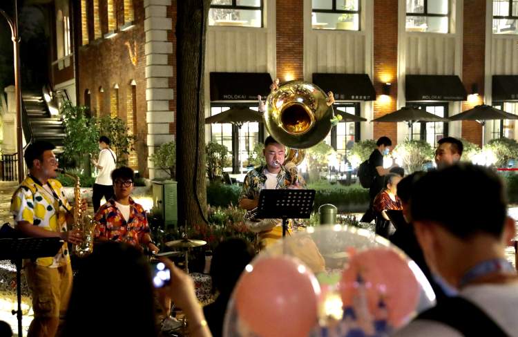 5点,乐队准时登场,市集舞台区前,游客听闻音乐声,陆续围拢过来,有人伴随着欢快的节奏摇摆起来。这是“小镇奇妙夜”的特别表演,每周五、六、日晚5点、6点、7点准点开演。