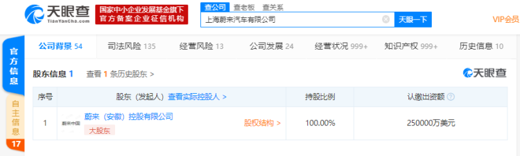 上海蔚来汽车有限公司成立于2015年5月,注册资本25亿美元,法定代表人为蔚来汽车联合创始人秦力洪,公司经营范围包括:在国家允许外商投资的领域依法进行投资;在中国境内设立科研开发中心或部门,从事新产品及高新技术的研究开发,转让其研究开发成果,并提供相应的技术服务等,由蔚来(安徽)控股有限公司全资控股。