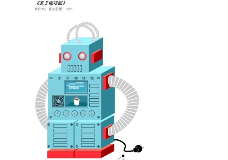 去咖啡馆不仅是为了喝咖啡,更重要的是为了社交。在居家隔离的月份里,就算我们家里有咖啡馆级别的咖啡原料和设备,但仍然缺乏咖啡馆里的人声与温暖。本装置通过冰冷机械的铁皮机器人提供的自助专业咖啡,思考人作为社交动物的个体与群体的关系,而作为物质状态的咖啡和咖啡馆,只是交往的藉口与媒介。终有一天,我们还要走出家门,面对面付出和接收彼此的温润。