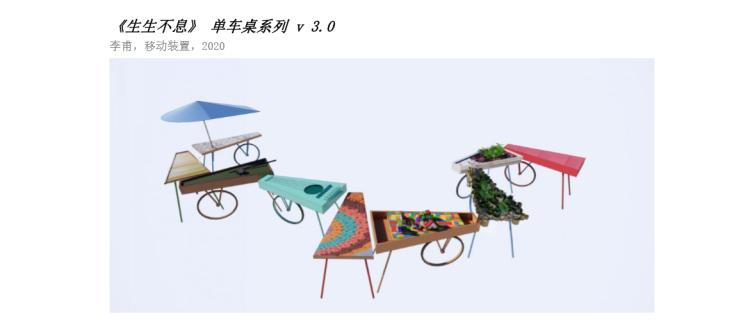 这些车轮曾经走遍城市的大街小巷,此刻凝固到家的场景中。架在自行车轮子上的桌面,和毛线、竹编、乐器、桌球、乐高、鱼缸、植栽、阳伞这些日常的材料配搭组合, 延续了生活的质感。暗示客厅、卧室、餐厅、阳台、街道等空间记忆的片段。