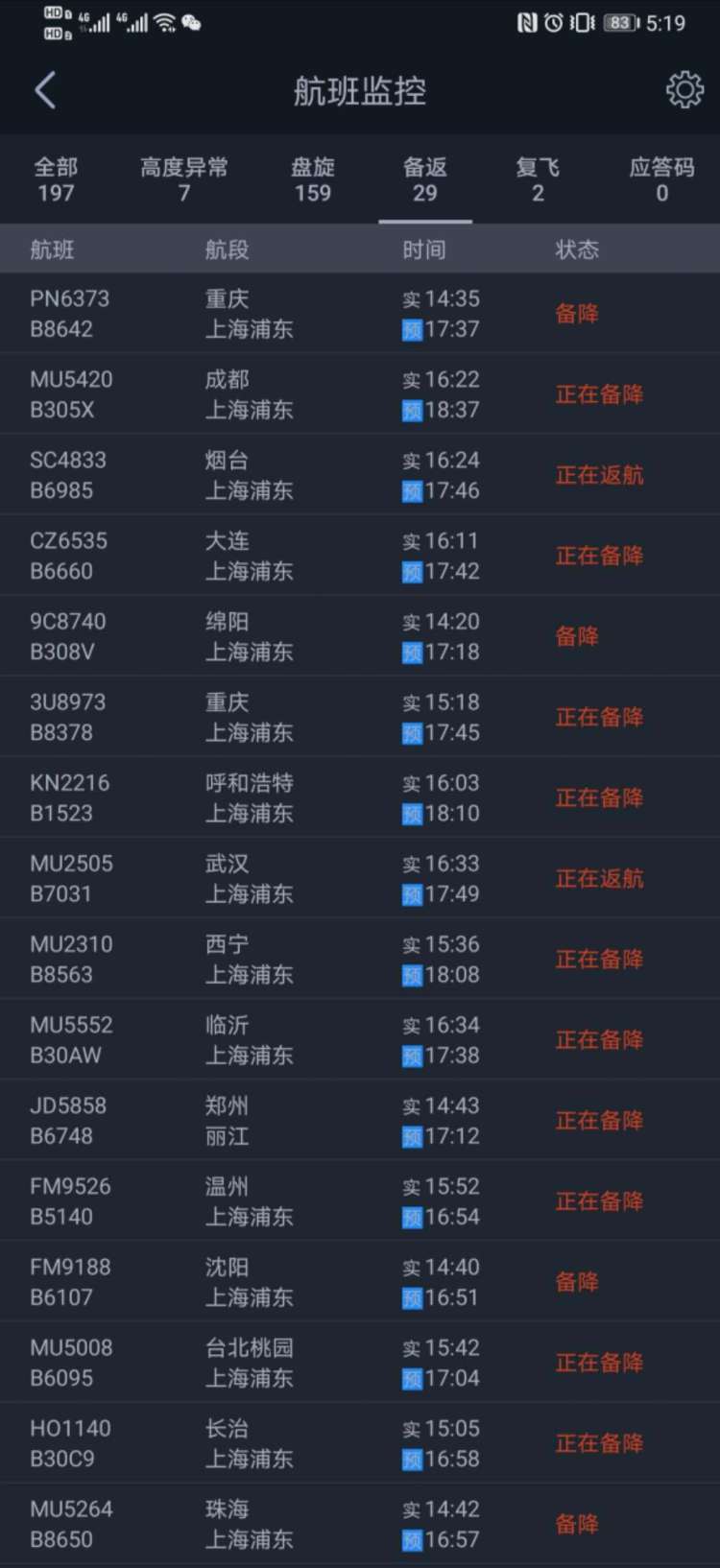 浦东机场最后进出港航班信息 (来源:飞常准)