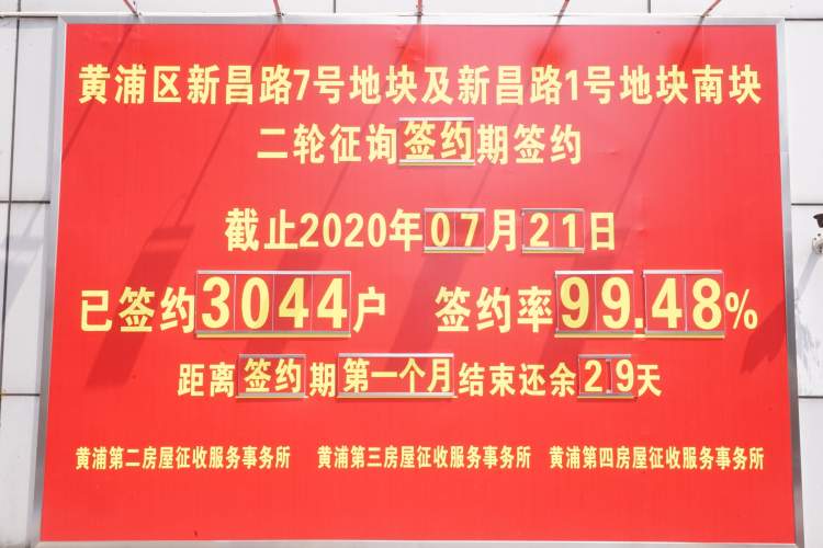 截至7月21日24时,新昌路1号地块(南块)和7号地块3060证(权证)居民中,当日完成签约3044证,签约率达99.48%;新昌路1号地块(北块)65证居民更是实现100%签约,实现了意愿征询、签约征询两个100%。