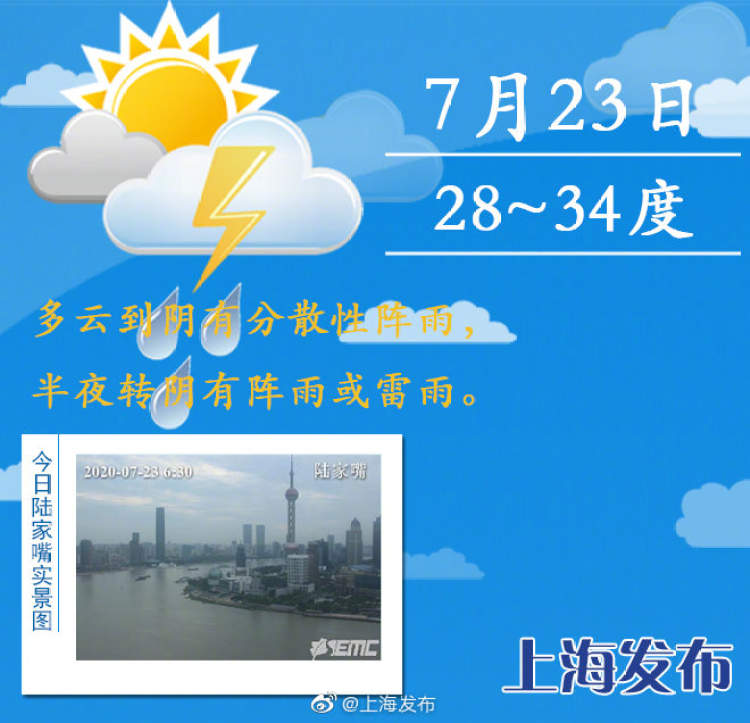 今天最高气温仍可达34-35℃。但别以为出了梅就会和雨水告别。受扩散冷空气影响,上海今明有一次明显的降水过程。今天傍晚雨水就将赶来,主要降水集中在今天夜间至明天上午。