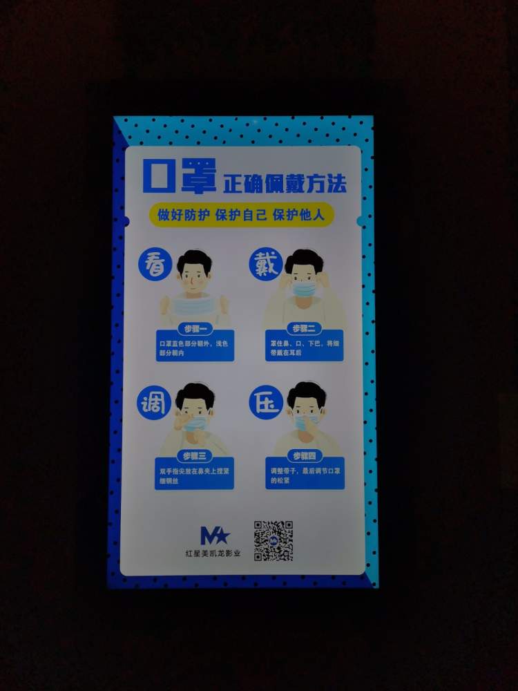 进入观影区,通道两旁的灯箱由循环滚动电影海报变为循环滚动防疫知识及影院的防疫措施。